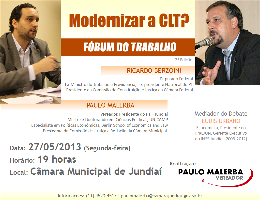 Esta mesa de debates será formada pelo Deputado Federal Ricardo Berzoini e pelo próprio Vereador Paulo Malerba. O mediador será o atual presidente do IPREJUN, Eudis Urbano (saiba mais sobre os debatedores abaixo).